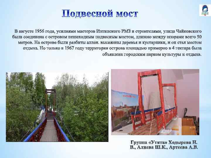 Он не только широко использовался для городских гуляний в дни различных празднеств, но и стал также местом ежедневных занятий спортом всех желающих интинцев. По парку проходит пешеходная дорожка, соединяющая город с совхозом «Большая Инта» , а так же с жилым микрорайоном города и садовыми участками местных жителей На сегодня подвесной мост стал неотъемлемой частью города. В летнее время мост особенно популярен среди интинцев, больше людей идет в парк для прогулок с детьми, катания на велосипедах, прогулок с животными.
