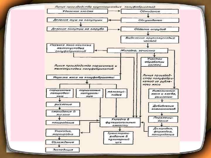 Организация работы мясного цеха • Мясные цехи организуются на крупных заготовочных предприятиях и предприятиях средней мощности, перерабатывающих сырье для своего производства. Технологический процесс обработки мяса не зависит от мощности цеха, но сама организация технологического процесса различается. На крупных заготовочных предприятиях мясные цехи более механизированы.