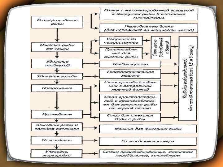 • С помощью чешуеочистительной машины типа РО-1 М очищают рыбу от чешуи; плавники срезают плавникорезкой, головы удаляют при помощи головоотсекающей машины. Далее рыба поступает на рыборазделочный конвейер, вдоль которого расположены рабочие места для потрошения и промывания рыбы. Удаление внутренностей и промывание рыбы производятся вручную. • Каждое рабочее место состоит из производственного стола со встроенными моечными ваннами. • Рабочие места оборудуются разделочными досками, ножами поварской тройки. • Потрошеную и промытую рыбу загружают в передвижные ванны и направляют к чану для фиксации (охлаждения) в 18%ном растворе поваренной соли с температурой - 4. . . - 6°С. • Рыбу подвергают фиксации в течение 5 -10 мин. • Фиксация применяется для сокращения потерь при хранении, транспортировке, сохранения пищевой ценности рыбы.