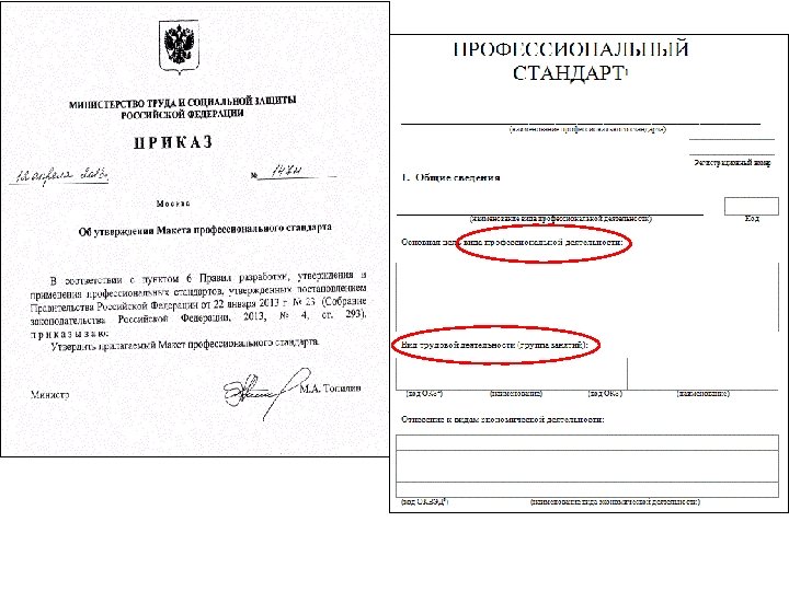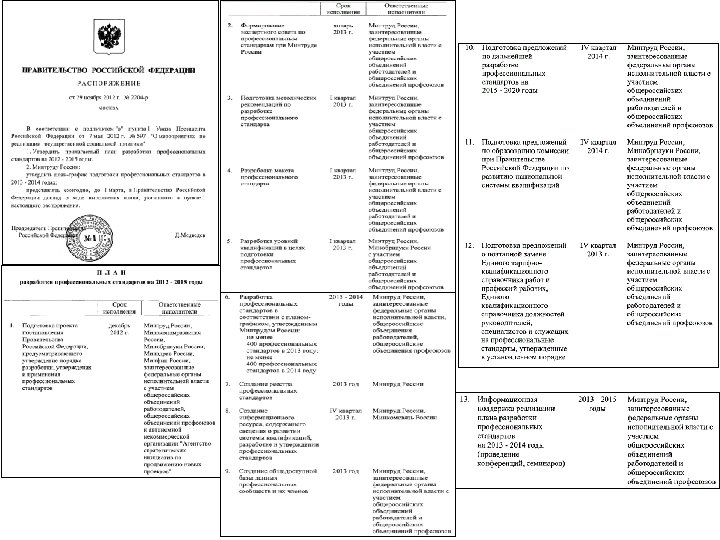 Правовая база профессиональных стандартов (появилась в конце 2012 г. – в начале 2013 г. ) Указ Президента Российской Федерации от 7 мая 2012 г. № 597: разработать к 2015 году и утвердить не менее 800 профессиональных стандартов Внесены изменения в Трудовой кодекс Постановление Правительства Российской Федерации от 22 января 2013 г. № 23 «О Правилах разработки, утверждения и применения профессиональных стандартов» Распоряжение Правительства Российской Федерации от 29 ноября 2012 г. № 2204, утвердившее План разработки профессиональных стандартов на 2012 -2015 годы Приказ Минтруда России от 30 ноября 2012 г. № 565 «Об утверждении план-графика подготовки профессиональных стандартов в 2013 -2014 годах»