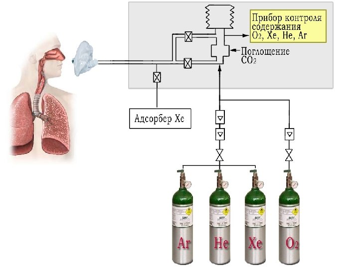На основе наркозного аппарата «Полинаркон-5» создан опытный образец многофункционального дыхательного аппарата l для лечения смесями He + O 2 больных с дыхательной недостаточностью (пневмония, бронхиальная астма, постинсультные, постинфарктные состояния, анемия, туберкулез и др. ) l для лечения смесями Xe+ O 2 ( восстановление иммунной системы пациентов (особенно в пожилом возрасте) l для лечения наркотической и алкогольной зависимости, токсикомании, постгипоксических повреждений ЦНС в психиатрии, неврологии и др. заболеваниях l для проведения наркозов при хирургических операциях l для лечения смесями Ar+O 2 иммунодефицита и расстройств половой сферы, для исследования воздействия Kr+O 2 смесей.