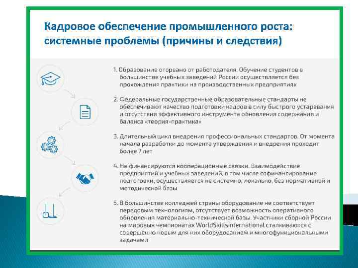 Предпосылки разработки стандарта Стандарт кадрового обеспечения промышленного роста региона разрабатывается в соответствии с пунктом 16 раздела I протокола заседания Правительственной комиссии по импортозамещению от 3 октября 2015 г. № 2: «Рекомендовать органам исполнительной власти субъектов Российской Федерации совместно с Минобрнауки России, союзом «Агентство развития профессиональных сообществ и рабочих кадров «Ворлдскиллс Россия» , автономной некоммерческой организации «Агентство стратегических инициатив по продвижению новых проектов» проработать вопрос внедрения регионального стандарта кадрового обеспечения промышленного роста, включающего в себя • механизмы обеспечения высокотехнологичных отраслей промышленности по сквозным рабочим профессиям на основе международных стандартов подготовки кадров, • внедрение элементов системы дуального обучения • Внедрение системы мониторинга качества подготовки кадров»