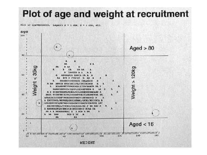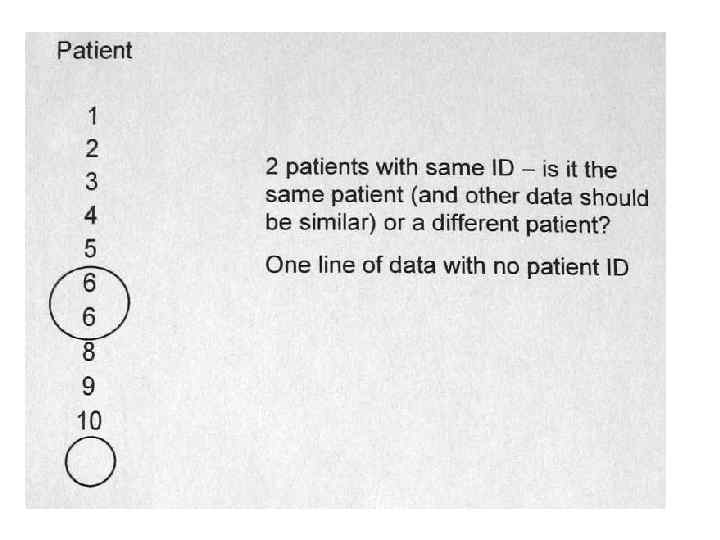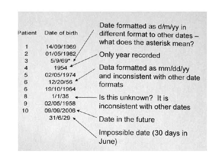 Практика сбора высококачественных данных: Простая проверка данных. Хорошая привычка – проводить простую проверку правильности введения данных в базу перед статанализом. – есть ли среди введенных дат явно несообразные/ непоследовательные? – все ли введенные даты событий больше дат рождения пациентов? Не заходят ли они за дату смерти? – если данные кодированы, нет ли в базе непредусмотренных кодов? – не выглядят ли непрерывные данные явно запредельными?