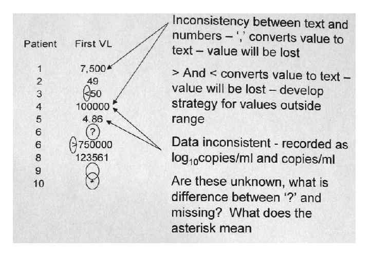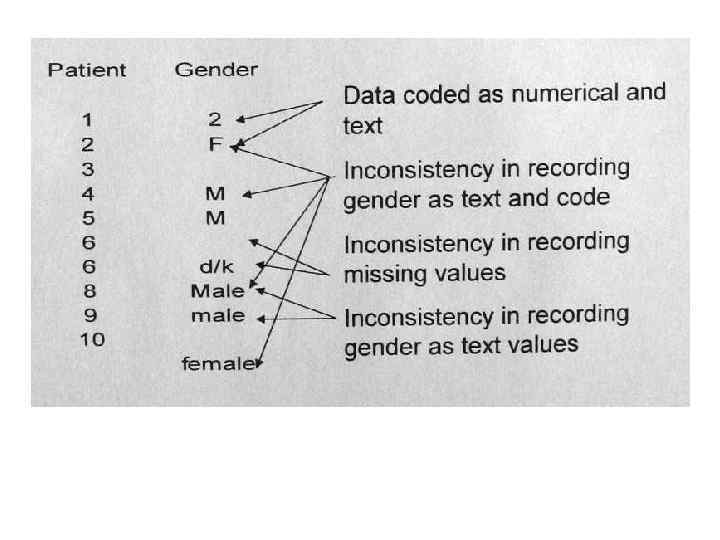 Практика сбора высококачественных данных: – Будьте последовательны Многие проблемы проистекают от непоследовательности при сборе и оформлении одинаковых данных. Например: данные одновременно хранятся в формате дд/мм/гг и мм/дд/гг, пол обозначается как «м/ж» , « 0/1» и « 1/2» в одной базе данных. – Старайтесь не трансформировать числовые переменные в категориальные до этапа анализа данных: Например: не выделяйте возрастные группы, группы по уровню какого-либо показателя (CD 4+ >200/мкл и т. п. )