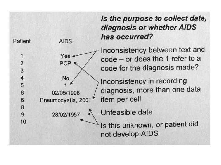 Практика сбора высококачественных данных: Что делать, если собрано много значений одной переменной для одного и того же случая? Такое часто бывает в «продольных» исследованиях, где выполняется мониторинг уровня CD 4+ лимфоцитов, вирусной нагрузки в плазме крови и т. п. в исследуемой выборке. Нужно создавать по переменной для каждого из значений, полученных в одинаковый момент времени: например, CD 4_1, CD 4_2, CD 4_3 и т. д. При этом каждой такой переменной должна быть сопоставлена переменная даты. Аналогично производится разложение по переменным сложных диагнозов, например, множества сопутствующих заболеваний при ВИЧ-инфекции (в ячейке можно указывать дату установления диагноза).