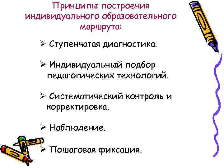 Принципы построения индивидуального образовательного маршрута: Ø Ступенчатая диагностика. Ø Индивидуальный подбор педагогических технологий. Ø Систематический контроль и корректировка. Ø Наблюдение. Ø Пошаговая фиксация.