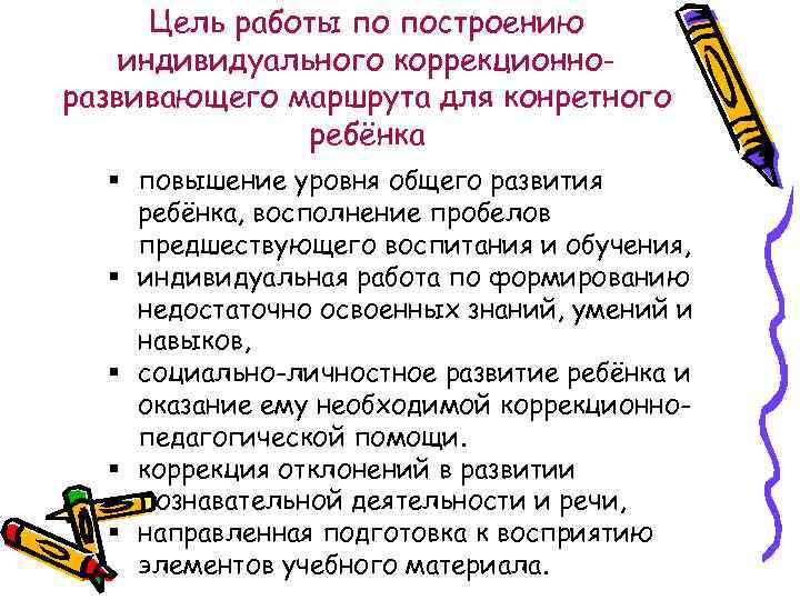 Цель работы по построению индивидуального коррекционно- развивающего маршрута для конретного ребёнка § повышение уровня общего развития ребёнка, восполнение пробелов предшествующего воспитания и обучения, § индивидуальная работа по формированию недостаточно освоенных знаний, умений и навыков, § социально-личностное развитие ребёнка и оказание ему необходимой коррекционно- педагогической помощи. § коррекция отклонений в развитии познавательной деятельности и речи, § направленная подготовка к восприятию элементов учебного материала.