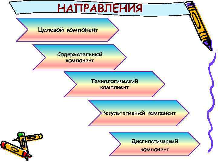 НАПРАВЛЕНИЯ Целевой компонент Содержательный компонент Технологический компонент Результативный компонент Диагностический компонент