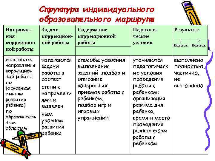 Структура индивидуального образовательного маршрута Направле- Задачи Содержание Педагоги- Результат ния коррекцион- коррекционной ческие 1 2 коррекцион ной работы условия Полугод. ной работы излагаются способы усвоения уточняются выполнено направления задачи выполнения педагогическ полностью, коррекцион работы в заданий , подбор и ие условия частично, ной работы соответ описание проведения не по (основным ствии с конкретных работы с выполнено линиям направлени приемов работы с ребенком: развития ями и ребенком, организация ребенка) выявлен подбор игр и режима дня по ным игровых ребенка, образователь упражнений время и место ным уровнем развития проведения областям ребенка разных форм работы с ребенком