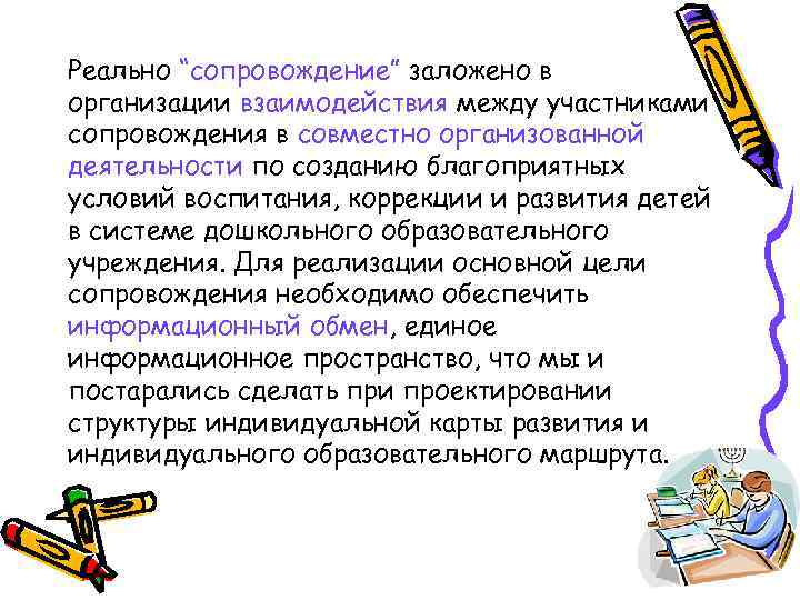 Реально “сопровождение” заложено в организации взаимодействия между участниками сопровождения в совместно организованной деятельности по созданию благоприятных условий воспитания, коррекции и развития детей в системе дошкольного образовательного учреждения. Для реализации основной цели сопровождения необходимо обеспечить информационный обмен, единое информационное пространство, что мы и постарались сделать при проектировании структуры индивидуальной карты развития и индивидуального образовательного маршрута.