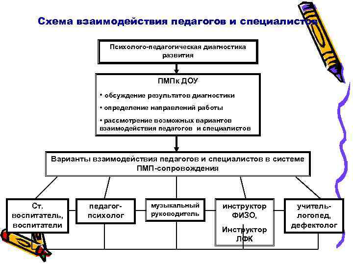 Схема взаимодействия педагогов и специалистов Психолого-педагогическая диагностика развития ПМПк ДОУ • обсуждение результатов диагностики • определение направлений работы • рассмотрение возможных вариантов взаимодействия педагогов и специалистов Варианты взаимодействия педагогов и специалистов в системе ПМП-сопровождения Ст. педагог- музыкальный инструктор учитель- воспитатель, психолог руководитель ФИЗО, логопед, воспитатели дефектолог Инструктор ЛФК