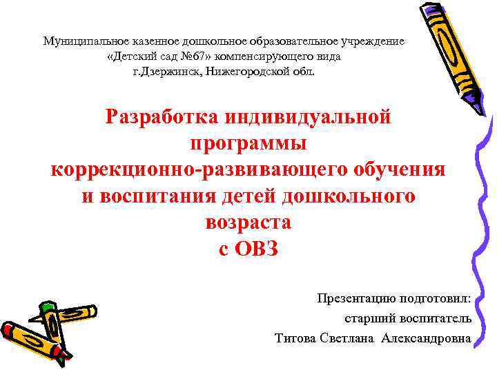 Муниципальное казенное дошкольное образовательное учреждение «Детский сад № 67» компенсирующего вида г. Дзержинск, Нижегородской обл. Разработка индивидуальной программы коррекционно-развивающего обучения и воспитания детей дошкольного возраста с ОВЗ Презентацию подготовил: старший воспитатель Титова Светлана Александровна
