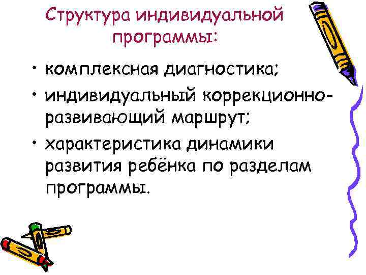 Структура индивидуальной программы: • комплексная диагностика; • индивидуальный коррекционно- развивающий маршрут; • характеристика динамики развития ребёнка по разделам программы.