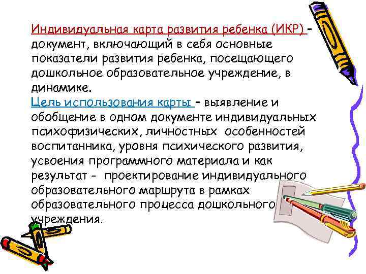 Индивидуальная карта развития ребенка (ИКР) – документ, включающий в себя основные показатели развития ребенка, посещающего дошкольное образовательное учреждение, в динамике. Цель использования карты – выявление и обобщение в одном документе индивидуальных психофизических, личностных особенностей воспитанника, уровня психического развития, усвоения программного материала и как результат - проектирование индивидуального образовательного маршрута в рамках образовательного процесса дошкольного учреждения.