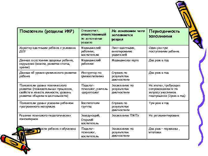 Показатели (разделы ИКР) Специалист, На основании чего Периодичность ответственный заполняется заполнения за заполнение раздел раздела Характер адаптации ребёнка к условиям Медицинский Лист адаптации, Один раз при ДОУ работник, анкетирование поступлении ребенка воспитатели родителей Данные о состоянии здоровья ребенка, Медицинский Медицинская карта Два раза в год нарушения (осанки, развития стопы, работник зрения) Данные об уровне физического развития Инструктор по Справка по Два раза в год ребенка физвоспитанию результатам диагностики Показатели уровня психического Педагог- Заключение по На этапах, требующих развития (познавательных процессов, психолог, учитель результатам сопровождения и по свойств и качеств личности, уровень -дефектолог диагностики запросу участников развития общения и деятельности) педпроцесса (3 раза в год) Показатели уровня усвоения ребенком Воспитатели Справка по Три раза в год программного материала группы результатам диагностики Решения психолого-педагогических Заведующий, Заключения ПМПк Не регламентирована консилиумов Старший воспитатель Уровень готовности ребенка к обучению Педагог- Заключение по Два раза – первичная , в школе психолог, результатам итоговая воспитатель диагностики
