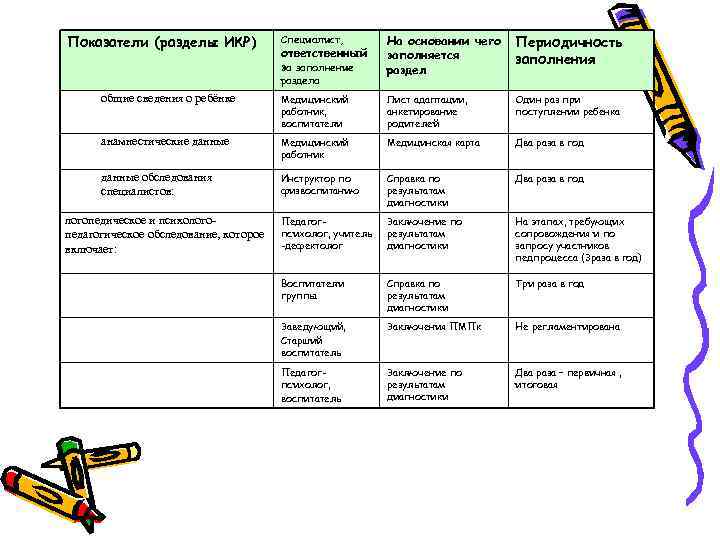 Показатели (разделы ИКР) Специалист, На основании чего Периодичность ответственный заполняется заполнения за заполнение раздел раздела общие сведения о ребёнке Медицинский Лист адаптации, Один раз при работник, анкетирование поступлении ребенка воспитатели родителей анамнестические данные Медицинский Медицинская карта Два раза в год работник данные обследования Инструктор по Справка по Два раза в год специалистов: физвоспитанию результатам диагностики логопедическое и психолого- Педагог- Заключение по На этапах, требующих педагогическое обследование, которое психолог, учитель результатам сопровождения и по включает: -дефектолог диагностики запросу участников педпроцесса (3 раза в год) Воспитатели Справка по Три раза в год группы результатам диагностики Заведующий, Заключения ПМПк Не регламентирована Старший воспитатель Педагог- Заключение по Два раза – первичная , психолог, результатам итоговая воспитатель диагностики