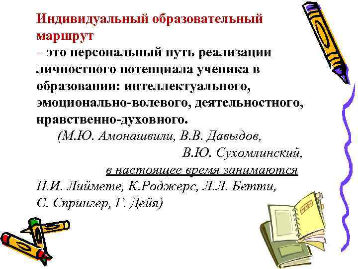 Индивидуальный образовательный маршрут – это персональный путь реализации личностного потенциала ученика в образовании: интеллектуального, эмоционально-волевого, деятельностного, нравственно-духовного. (М. Ю. Амонашвили, В. В. Давыдов, В. Ю. Сухомлинский, в настоящее время занимаются П. И. Лиймете, К. Роджерс, Л. Л. Бетти, С. Спрингер, Г. Дейя)