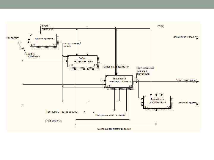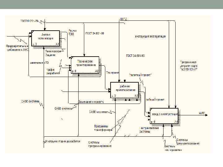 Стадии проектирования(жизненный цикл проектирования) Предпроектные • исследования (анализ) Исследуются необходимость в системе. уровень знаний, ресурсы. Техническое задание и техническое обоснование Эскизное проектирование Проверяется корректность ТЗ и выполнимость проекта, принципы и положения функционирования системы. Разработка и автономная отладка компонент системы Эскизный проект Техническое проектирование Полная проработка всех частей проекта. Разработка макета системы. Комплексная отладка всех компонент в составе макета системы Технический проект Рабочее проектирование Разрабатывается опытный (рабочий) образец системы. Разрабатывается программная и техническая документация. Рабочий Проект + образец системы Испытания Проверка функционирования в составе других систем. Эксплуатация системы. Исправление замеченных недостатков. Информацио нная Система .