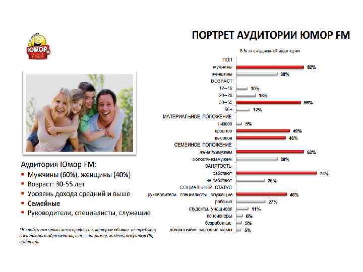 Целевая аудитория • Население г. Сибай - 62 562 человек (2014 год). Агломерация (это слияние крупнейших городских поселений) более 68 000. • Целевая аудитория Юмор FM – в основном, это семейные люди в возрасте от 30 – 55 лет со средним и выше уровнем дохода. • ЦА ЮМОР FM в городе Сибае предположительно может составлять около 40 тысяч человек.