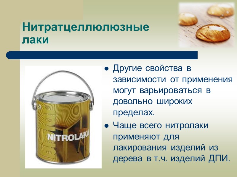 Нитратцеллюлюзные лаки Нитролаки получают путем растворения нитрата целлюлозы (лакового коллоксилина) в смеси активных органических растворителей. Для направленного регулирования свойств лаков в композицию вводятся различные смолы (алкидные, аминоформальдегидные и др.). Нитролаки образуют твердые прозрачные практически бесцветные быстросохнущие пленки.
