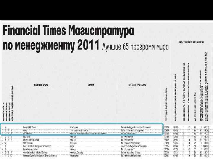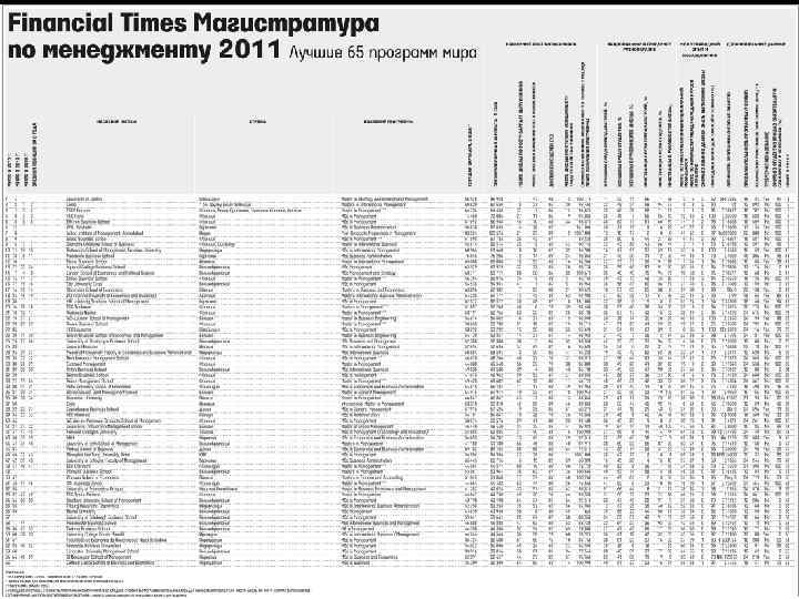 Лучшие магистерские программы по менеджменту (Mi. M). Рэнкинг Financial Times 2011 • • Как считали рэнкинг FT Рэнкинг составляется на основании данных, полученных от школ и выпускников. Полученным данным присвоен различный вес: 20% средневзвешенная зарплата выпускников, т. е. средняя зарплата через три года после выпуска, скорректированная с учетом разницы в отраслях. 5% окупаемость расходов: место школы по росту зарплат выпускников, высчитывается как зарплата через три года после выпуска минус расходы на обучение. 10% карьерный рост: статус через три года после выпуска с учетом уровня должности и величины компании. 5% достижение целей: в какой степени выпускники достигли целей обучения по программе Mi. M. 5% эффективное трудоустройство: балл рассчитывается исходя из процента выпускников, которым удалось найти работу с помощью карьерного центра школы. 5% трудоустройство в первые три месяца: процент устроившихся на работу в первые три месяца; в скобках — процент выпускников, по которым школа предоставила эти данные. 3% женщины среди преподавателей. 3% женщины среди студентов. 1% женщины в руководстве. 5% иностранцы среди преподавателей. 5% иностранцы среди студентов. 2% иностранцы в руководстве. 6% процент преподавателей с докторской степенью. 10% международный опыт: насколько увеличился список стран, где работали выпускники программы сразу после окончания программы и сейчас. 10% международные курсы и практики, показатель, высчитываемый по четырем критериям, которые характеризуют интернационализацию в процессе обучения. 5% количество иностранных языков, которое слушатель должен знать по окончании программы.