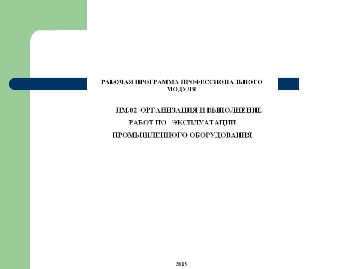 15. 02. 01. Монтаж и техническая эксплуатация промышленного оборудования ПМ. 01. Организация и проведение монтажа и ремонта промышленного оборудования МДК. 01. Организация монтажных работ промышленного оборудования и контроль за ними МДК. 01. 02. Организация ремонтных работ промышленного оборудования и контроль за ними Практика ПМ. 02. Организация и выполнение работ по эксплуатации промышленного оборудования МДК. 02. 01. Эксплуатация промышленного оборудования ПМ. 03. Участие в организации производственной деятельности структурного подразделения МДК. 03. 01. Организация работы структурного подразделения ПМ. 04. Выполнение работ по одной или нескольким профессиям рабочих, должностям служащих МДК. 04. 01. Выполнение работ по профессии слесаря ремонтника Практика