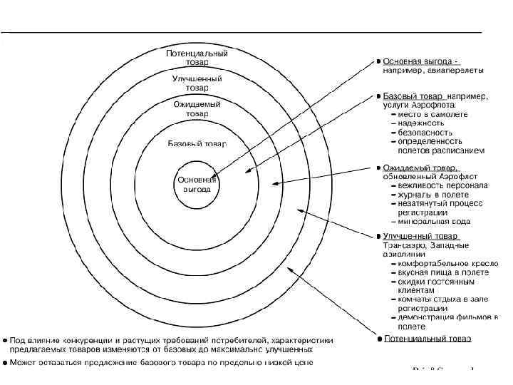 Уровни товара 1) Основная выгода – услуга или польза, приобретаемая покупателем 2) Основной товар – основная выгода, воплощенная в товар 3) Ожидаемый товар - набор свойств и характеристик, качества и сервиса, которые покупатель ожидает получить при покупке товара 4) Дополненный товар - товар улучшенный, с дополнительными выгодами, превышающими ожидания потребителя 5) Потенциальный товар – возможные будущие дополнения и модификации товара. Новые способы удовлетворения потребителей.