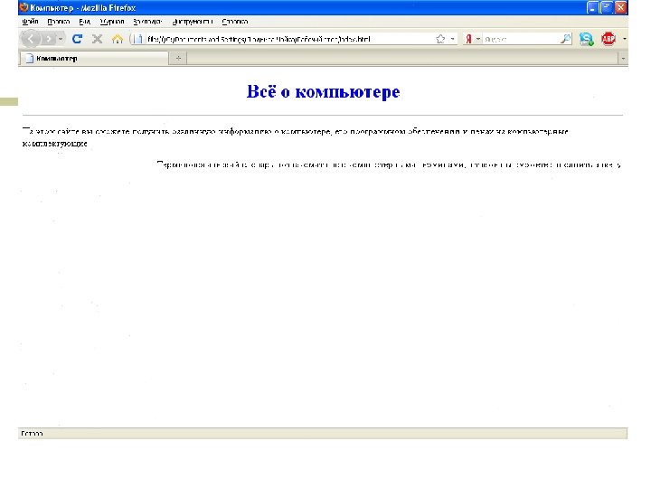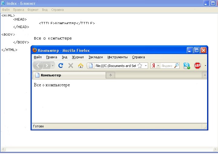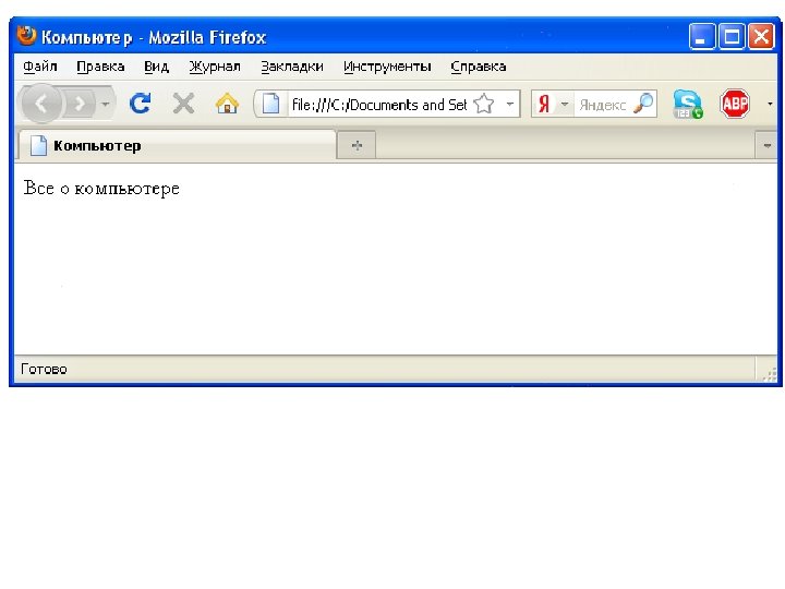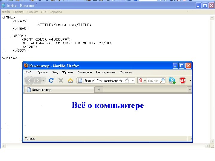 Создаем свой сайт…. Нужно различать имя файла index. html - под которым Web-страница хранится в файловой системе, и собственно имя Web-страницы «Компьютер» - высвечивается в верхней строке окна браузера и в первую очередь анализируется поисковыми системами. Имя Web-страницы должно в максимальной степени соответствовать ее содержанию. 1. В Блокнот ввести HTML-код Web-страницы. 2. Сохранить файл под именем index. html в папке сайта. Выбрать тип файла – «Все файлы» . 3. Открыть этот файл в браузере для просмотра.