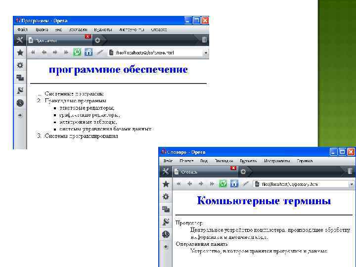 Список определений располагается внутри контейнера <DL>/<DL>. Внутри него текст оформля ется в виде терминов, которые выделяются одинарными тэгами <DT> и определений, которые следуют за одинарными тэгами <DD>. Web-страницу «Словарь» мы представим в виде словаря компьютерных терминов <DL> <DТ>Процессор <DD>Центральное устройство компьютера, производящее обработку информации в двоичном коде. <DТ>Оперативная память <DD>Устройство, в котором хранятся программы и данные. </DL>