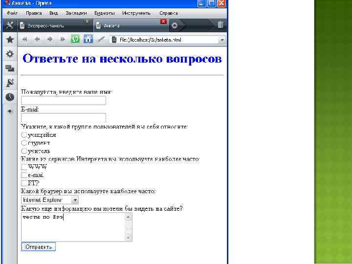 Щелчком по кнопке Отправить можно отправить данные из формы на определенный адрес электронной почты. Для этого атрибуту ACTION контейнера <FORM> надо присвоить значение адреса электронной почты. Кроме того, в атрибутах METOD и ENCTYPE необходимо указать метод и форму передачи данных: <FORM ACTION="mailto: username@server. ru" METHOD="POST" ENCTYPE="text/plain"> После открытия в браузере Web-страницы «Анкета» и внесения данных в поля формы необходимо щелкнуть по кнопке Отправить. Данные будут отправлены по указанному адресу электронной почты.