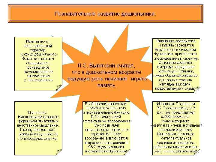 Основное интеллектуальное достижение дошкольного возраста - ребенок начинает мыслить в уме, во внутреннем плане. Но это мышление крайне несовершенно, его основной отличительной особенностью является эгоцентризм. Важное значение в интеллектуальном развитии ребенка придается также моменту саморазвития, самостоятельности и активности познания самого ребенка, а также интенсивное развитие речи.