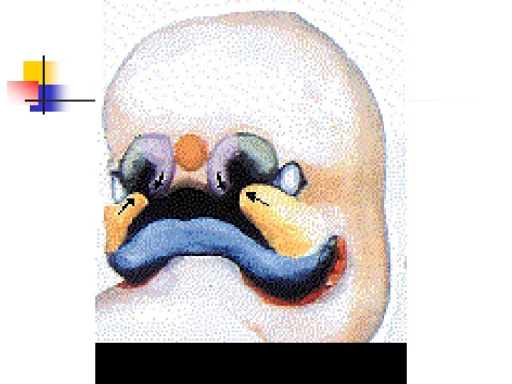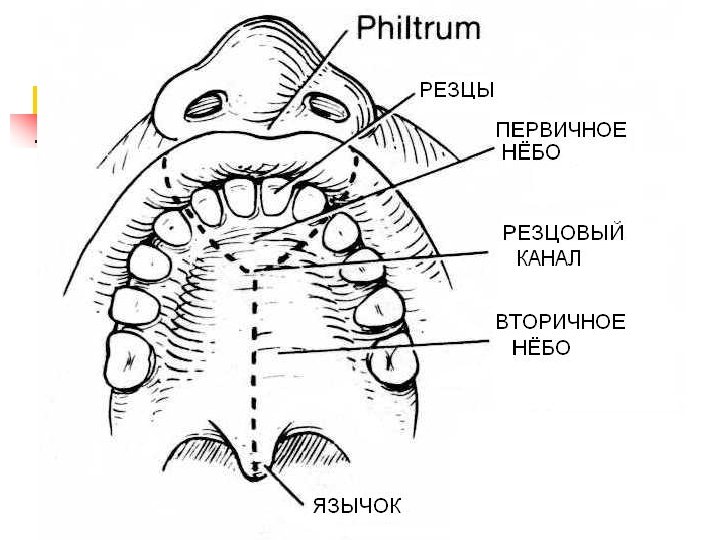 Формирование нёба n n Два боковых нёбных отростка (вторичное нёбо) Срединный нёбный отросток (первичное нёбо) В месте слияния всех отростков остается отверстие (резцовое)
