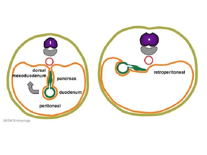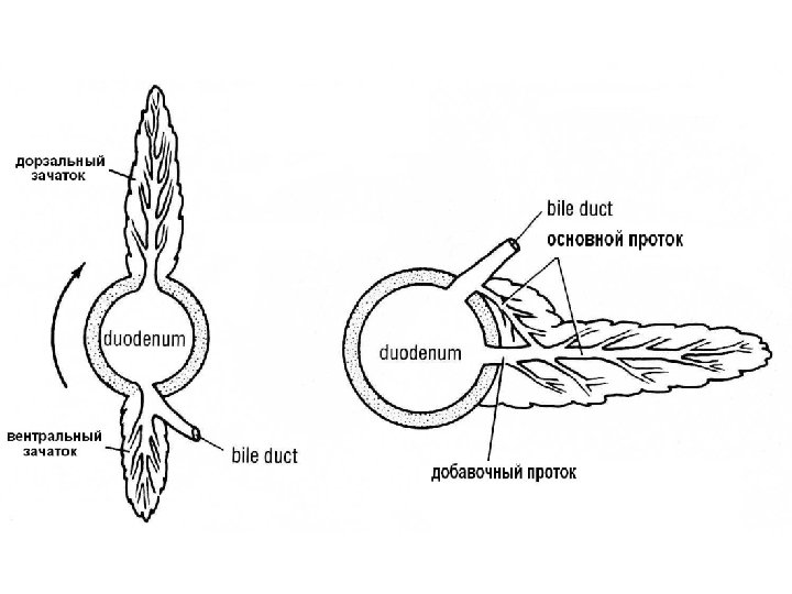 Развитие поджелудочной железы n ПЖ развивается из 2 зачатков дорзального и вентрального: n n n Вентральный зачаток – вырост из печеночного зачатка Дорзальный зачаток – вырост 12 п. к. в дорзальную брыжейку желудка Аномалия развития – несращение двух зачатков