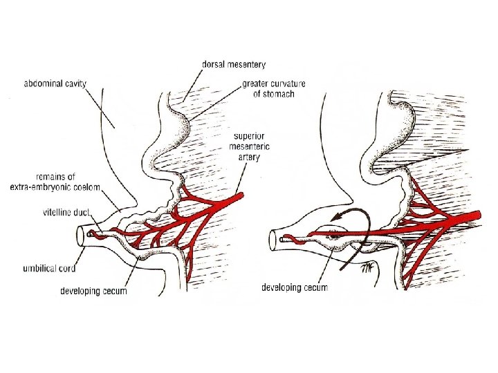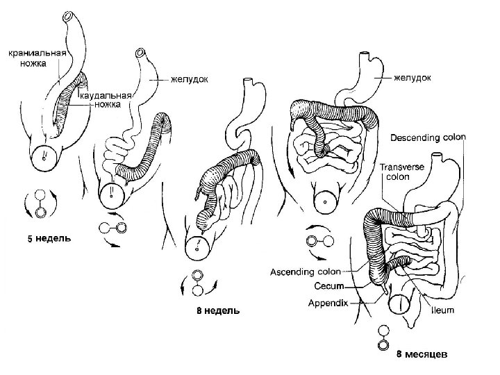 n n Средняя кишка имеет два колена – краниальное и каудальное Краниальное колено растет быстрее, и когда кишка выходит в пупочный канатик (физиологическая пупочная грыжа, 5 -10 недели развития) – она поворачивается на 270 (90 +180 )