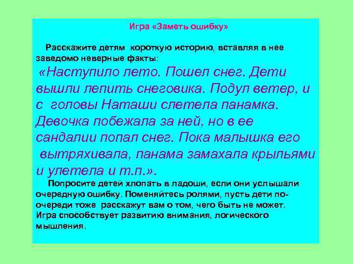 Игра «Заметь ошибку» Расскажите детям короткую историю, вставляя в нее заведомо неверные факты: «Наступило лето. Пошел снег. Дети вышли лепить снеговика. Подул ветер, и с головы Наташи слетела панамка. Девочка побежала за ней, но в ее сандалии попал снег. Пока малышка его вытряхивала, панама замахала крыльями и улетела и т. п. » . Попросите детей хлопать в ладоши, если они услышали очередную ошибку. Поменяйтесь ролями, пусть дети поочереди тоже расскажут вам о том, чего быть не может. Игра способствует развитию внимания, логического мышления.