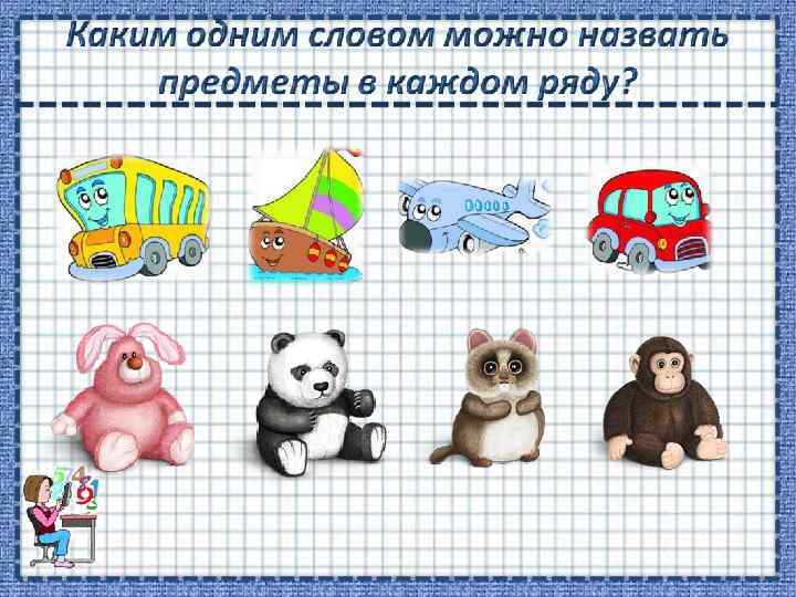 Относить к определенной группе предметов (одежды, мебели, дом. животн. и т. д. ) называть обобщ. словом Выделять лишний по какому -то признаку предмет из группы предметов. Называем признак предмета противопоставляющий их (мороженое холодное, а суп горячий) Называть признак, объеденяющий предметы (это все металлическое, эти предметы могут летать и т. д. )