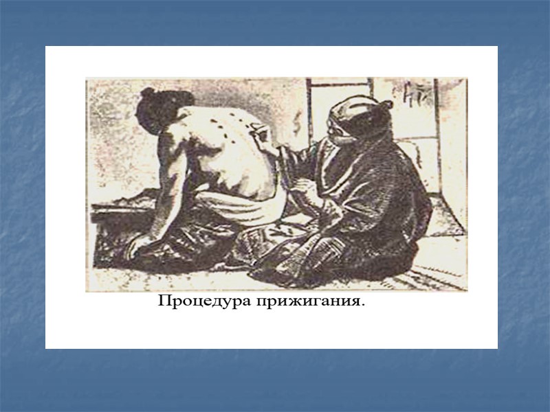Особенностью традиционной китайской медицины является и чжень –цзю – терапия. «Чжень» – иглоукалывание, «цзю» – прижигание. Эмпирические корни уходят в глубокую древность. Вывод о существовании «жизненных точек», способствующих регуляции жизненных процессов – восстанавливают нарушенное равновесие «инь – ян». Первые иглы были каменные, потом из кости, бамбука, металлов: бронзы, серебра, золота, платины. Иглотерапия применялась с массажем и прижиганием. Прикладывались зажженные сигареты, наполненные сухими листьями лекарственных растений. Мокка- полынь. Прижигание прямое и непрямое.