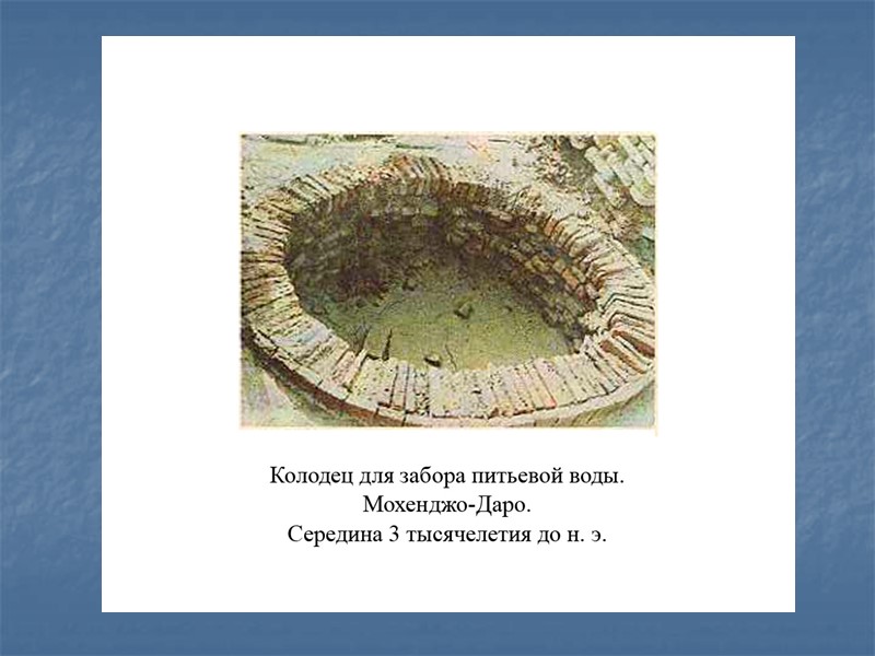Были и гигиенические традиции. Нельзя было выбрасывать нечистоты на улицы города. Трупы умерших сжигали в специально отведенных местах. За 2 века до римского водопровода в Индии уже существовала система канализации, строились колодцы, бани, бассейны. Каждая улица и переулок имели свой выложенный кирпичом канал глубиною и шириной = 0,5 м. Сверху прикрывались кирпичами, которые хорошо снимались при осмотре. Перед поступлением в канал сточная вода проходила через отстойники и выгребные ямы. В 1922г. В долине Инда был обнаружен Мохенджо-Даро (холм мертвых) на глубине 12 м, относящийся ~ к XXV в. до н.э.