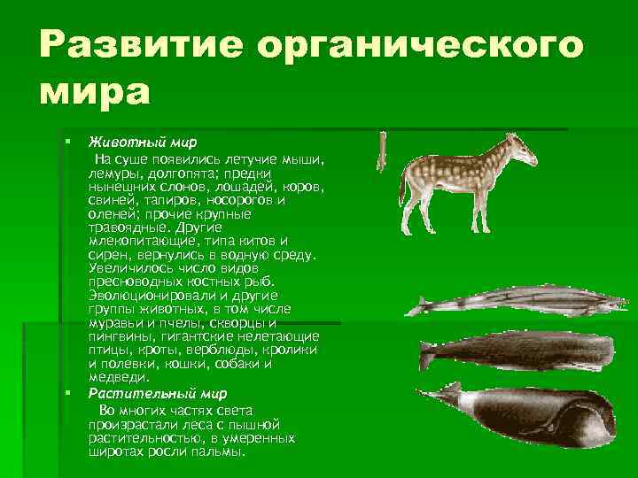 Развитие органического мира § § Животный мир На суше появились летучие мыши, лемуры, долгопята; предки нынешних слонов, лошадей, коров, свиней, тапиров, носорогов и оленей; прочие крупные травоядные. Другие млекопитающие, типа китов и сирен, вернулись в водную среду. Увеличилось число видов пресноводных костных рыб. Эволюционировали и другие группы животных, в том числе муравьи и пчелы, скворцы и пингвины, гигантские нелетающие птицы, кроты, верблюды, кролики и полевки, кошки, собаки и медведи. Растительный мир Во многих частях света произрастали леса с пышной растительностью, в умеренных широтах росли пальмы.