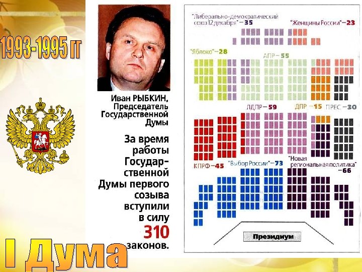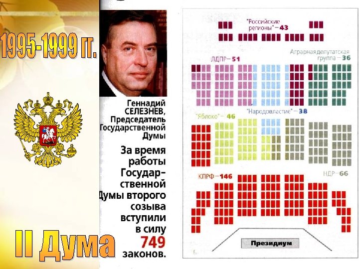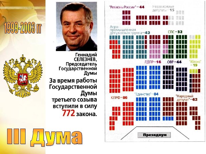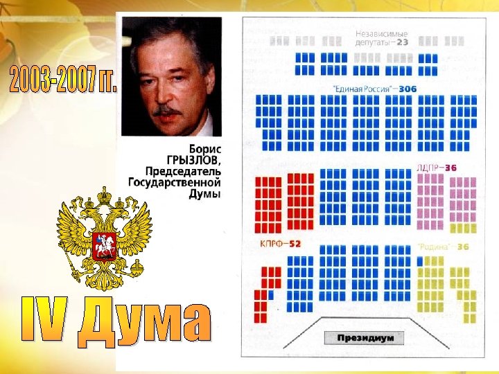 Распределение мест в Государственной Думе VII созыва Фракция Единая Россия КПРФ ЛДПР Справедливая Россия Число депутатов 343 42 39 23 Процент от общего числа депутатов % 76, 2 9, 3 8, 6 5, 1