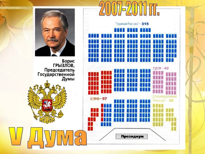 Вячеслав Викторович Володин, Председатель Государственной Думы Единая Россия(343) КПРФ (42) Справедливая Россия (23) ЛДПР (39) Родина (1) Гражданская платформа (1) Самовыдвиженец (1)