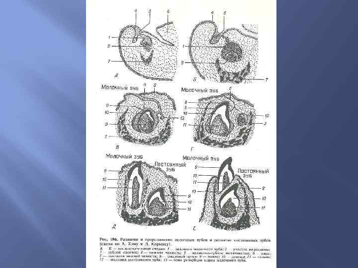 Развитие слюнных желез Околоушная слюнная железа развивается из эпителия ротовой полости, т. е. эктодермального происхождения. Подчелюстная и подъязычная слюнные железы развиваются из эпителия глотки, т. е. энтодермального происхождения. Развитие зубов На 7 -й неделе эмбрионального периода развития эктодерма верхних и нижних челюстных отростков образует зубные пластинки, погружающиеся в мезенхиму челюстных отростков. Из этих пластинок формируются эмалевые органы, клетки которых — адамантобласты образуют эмаль. Мезенхима образует зубной сосочек, адамантобласты которого образуют дентин, а ментобласты — цемент. ш