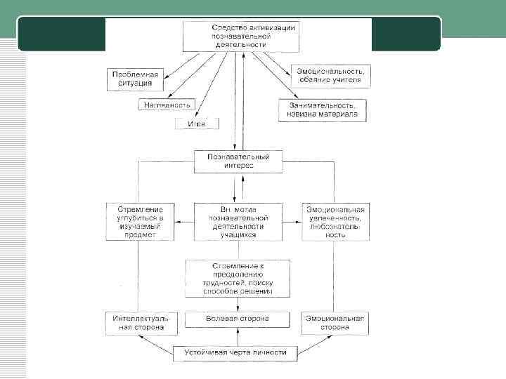 Познавательный интерес как мотив познавательной деятельности (С. Л. Рубинштейн) Как мотив учения познавательный интерес имеет ряд преимуществ перед другими мотивами, которые могут существовать вместе и наряду с ним (социальные, профессиональные). 1. Раньше других мотивов осознается школьником. 2. Более точно выражает мотивацию учения. 3. Более доступен для наблюдения. Его легче обнаружить, распознать, вызвать, легче управлять его формированием. 4. Имеет меньшую ситуативную сфокусированность, чем интерес как средство обучения. Он побуждает школьника заниматься увлеченно не только на уроке или в процессе подготовки домашнего задания. 5. Является звеном в системе мотивации и не обособлен от других мотивов, которыми однозначно руководствуется школьник. 6. Взаимосвязан с такими личностными свойствами человека, как активность, самостоятельность, под влиянием которых он сам развивается и способствует развитию этих свойств.