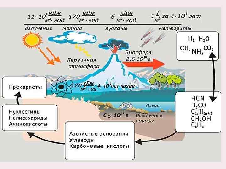 Комплекс условий на первичной Земле Достаточно высокая температура поверхности планеты Активная вулканическая деятельность Грозовые электрические разряды Результат их воздействия Синтез органических веществ из неорганических соединений, протекающий в водной среде Ультрафиолетовое излучение