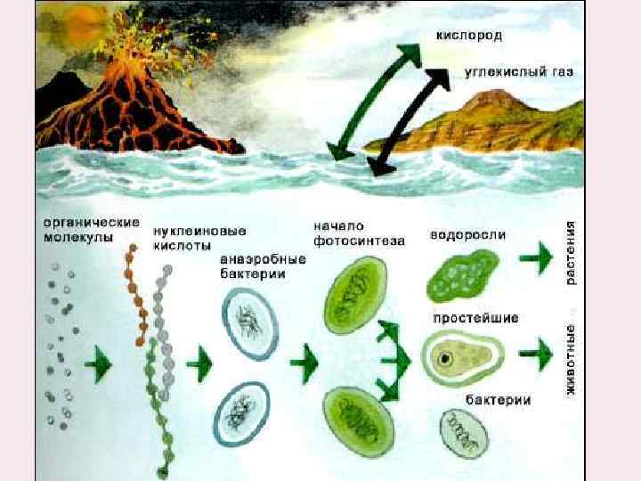 Эволюция пробионтов Анаэробные гетеротрофы Хемотрофные бактерии Фототрофные бактерии с ФС-1 Источник С – CO 2 , H – H 2 S Сине-зеленые с ФС-2 Источник С – CO 2 , H – H 2 O Фотолиз воды Обособление ядра Симбиоз анаэробной клетки с аэробными бактериями→митохондрии Симбиоз анаэробной клетки с сине-зелеными→хлоропласты