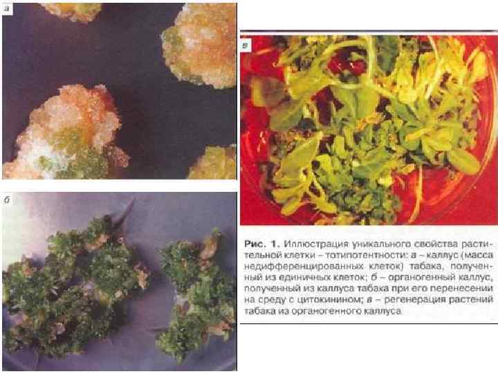Выращивание целого растения из клеток каллуса В культуре каллуса Fressia (А) индуцировали сначала развитие побегов (Б), а затем корней (В), меняя соотношение ауксинов и цитокининов в среде. Для формирования побегов и листьев цитокинина в среде должно быть больше, чем ауксина.