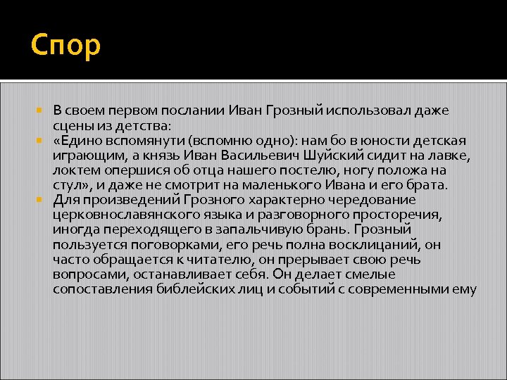 Спор В своем первом послании Иван Грозный использовал даже сцены из детства: «Едино вспомянути (вспомню одно): нам бо в юности детская играющим, а князь Иван Васильевич Шуйский сидит на лавке, локтем опершися об отца нашего постелю, ногу положа на стул» , и даже не смотрит на маленького Ивана и его брата. Для произведений Грозного характерно чередование церковнославянского языка и разговорного просторечия, иногда переходящего в запальчивую брань. Грозный пользуется поговорками, его речь полна восклицаний, он часто обращается к читателю, он прерывает свою речь вопросами, останавливает себя. Он делает смелые сопоставления библейских лиц и событий с современными ему