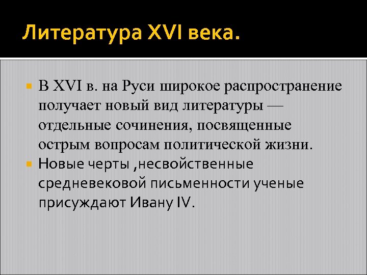 Литература XVI века. В XVI в. на Руси широкое распространение получает новый вид литературы — отдельные сочинения, посвященные острым вопросам политической жизни. Новые черты , несвойственные средневековой письменности ученые присуждают Ивану IV.
