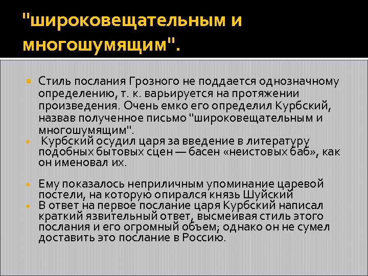 "широковещательным и многошумящим". Стиль послания Грозного не поддается однозначному определению, т. к. варьируется на протяжении произведения. Очень емко его определил Курбский, назвав полученное письмо "широковещательным и многошумящим". Курбский осудил царя за введение в литературу подобных бытовых сцен — басен «неистовых баб» , как он именовал их. Ему показалось неприличным упоминание царевой постели, на которую опирался князь Шуйский В ответ на первое послание царя Курбский написал краткий язвительный ответ, высмеивая стиль этого послания и его огромный объем; однако он не сумел доставить это послание в Россию.