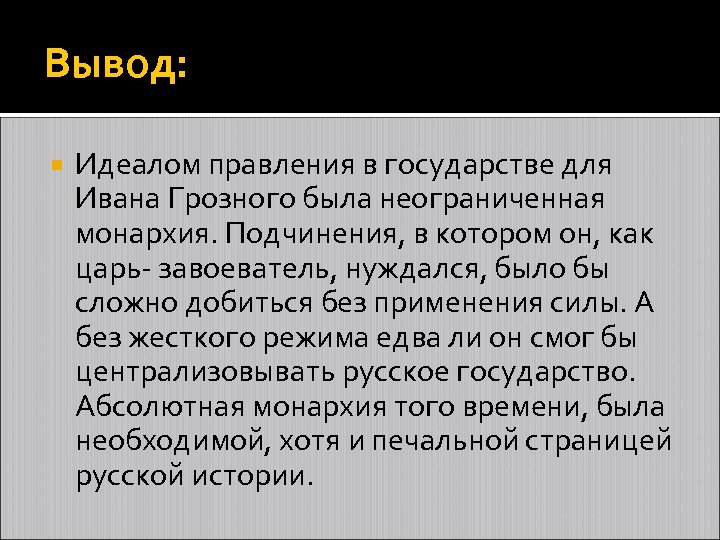 Вывод: Идеалом правления в государстве для Ивана Грозного была неограниченная монархия. Подчинения, в котором он, как царь- завоеватель, нуждался, было бы сложно добиться без применения силы. А без жесткого режима едва ли он смог бы централизовывать русское государство. Абсолютная монархия того времени, была необходимой, хотя и печальной страницей русской истории.